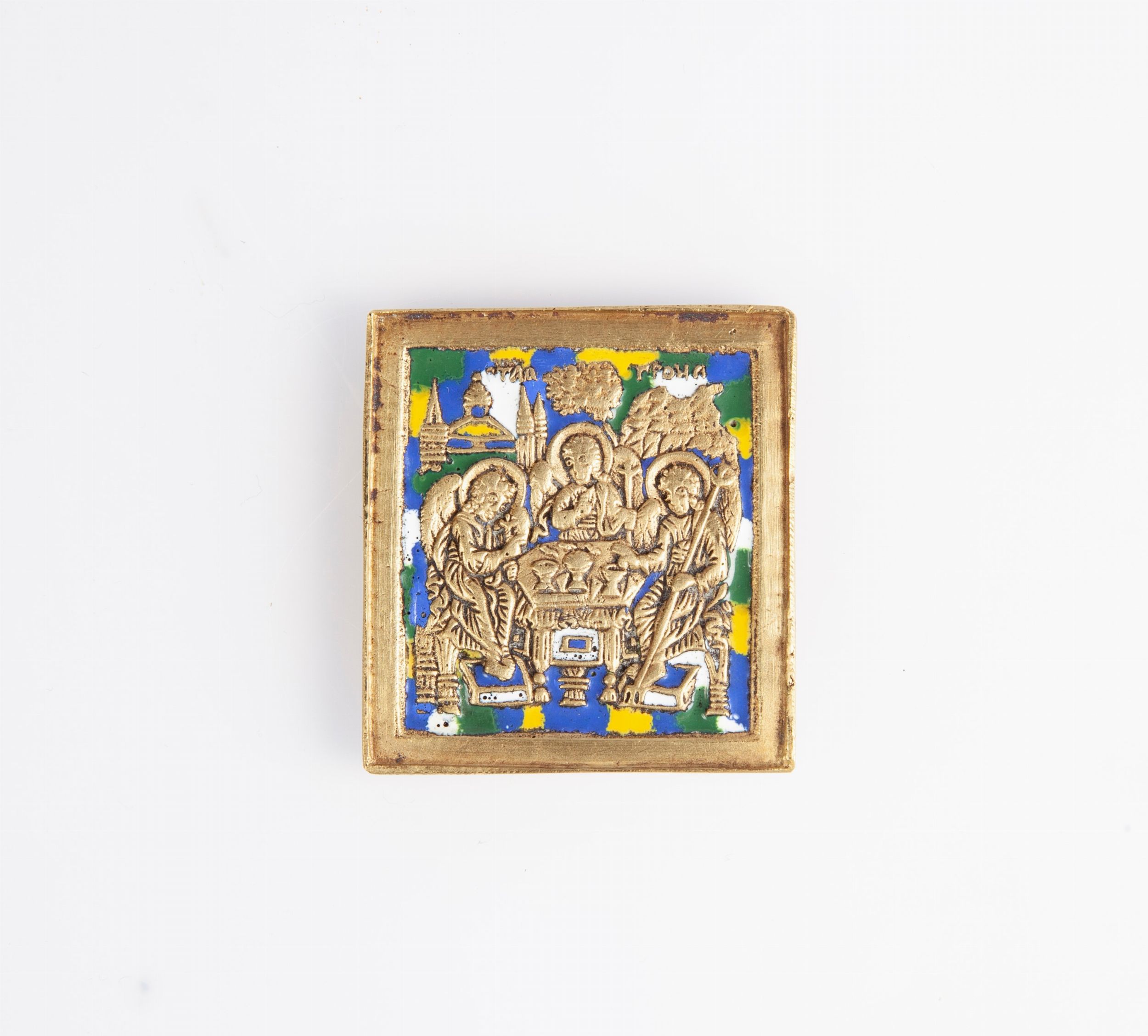 cm 5,3x4,8 raffigurante la Trinità dell'Antico Testamento; le tre figure, rappresentate come Angeli, siedono intorno a una tavola imbandita, prefigurazione dell’altare su cui si celebra il mistero eucaristico