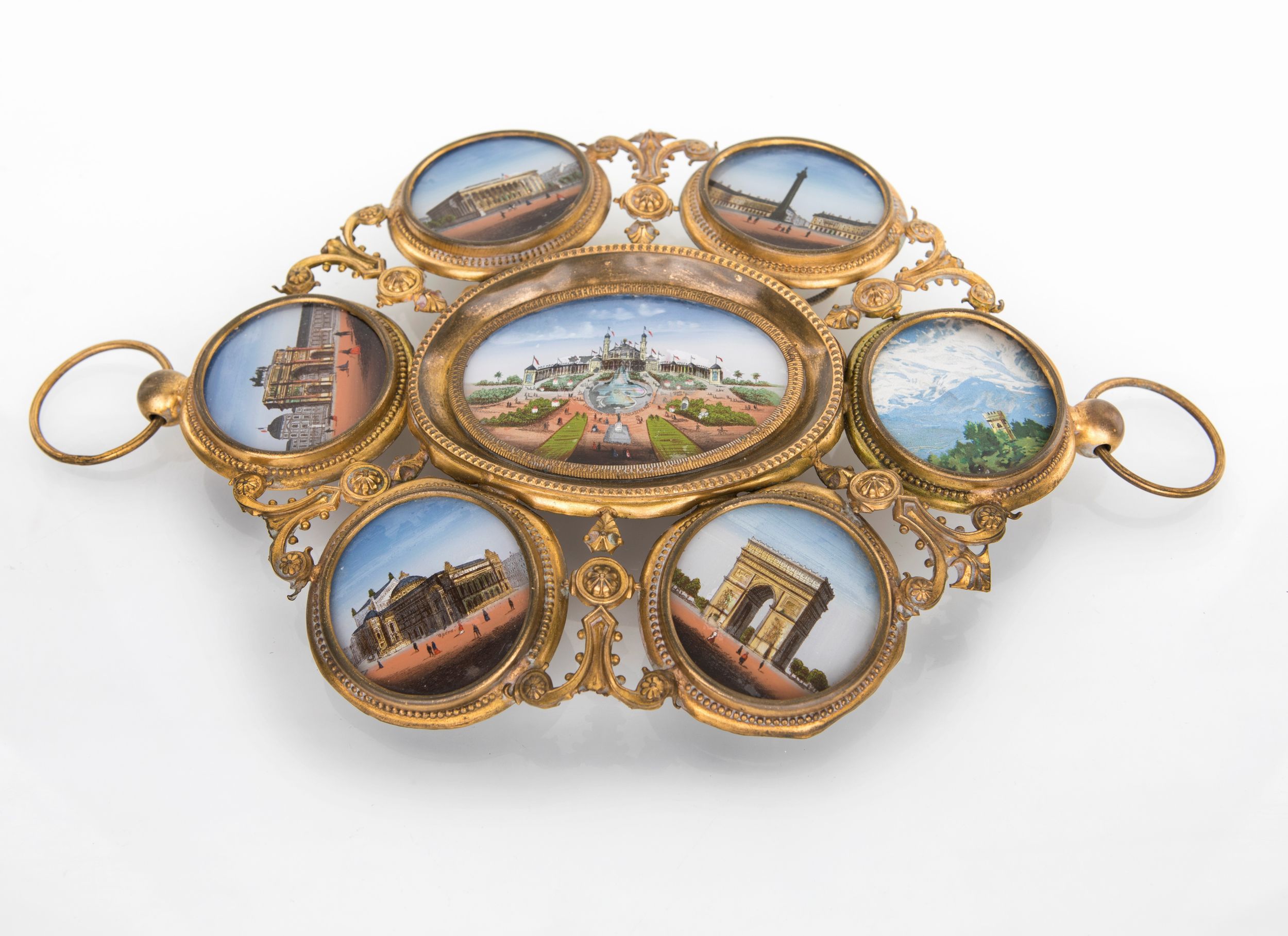 cm 17x29 - miniature diametro cm 5 e cm 5x7,5 caratterizzato da sette miniature su vetro con inserti in madreperla, di cui sei raffiguranti vedute di Parigi; al centro i giardini del Trocadero e tutt'intorno si dispongono l'Arco di Trionfo del Carrousel col Palazzo del Louvre, Palazzo Brogniart in stile corinzio, Piazza Vendôme, l'Opéra Garnier e l'Arco di Trionfo; una settima miniatura non pertinente raffigura uno scorcio montano. Struttura danneggiata
