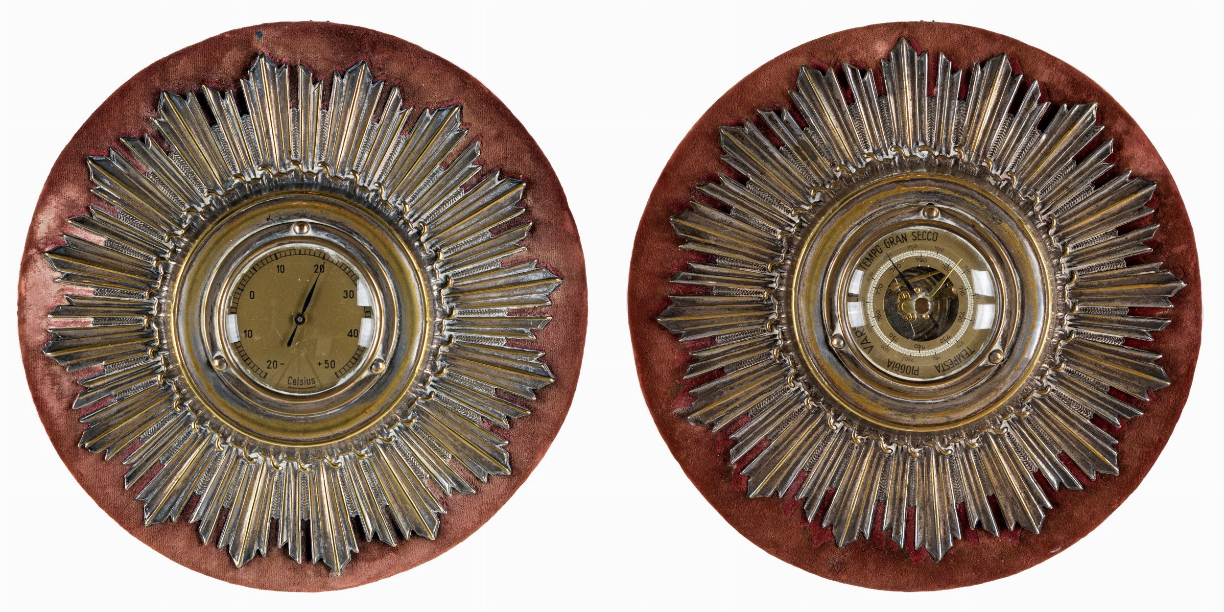 diametro cm 21,5 con quadrante circolare entro ampia cornice a raggiera; il termometro con gradi Celsius indicati a numeri arabi, iscritto made in Western Germany; il barometro con indicazioni climatiche in italiano è Made in Germany