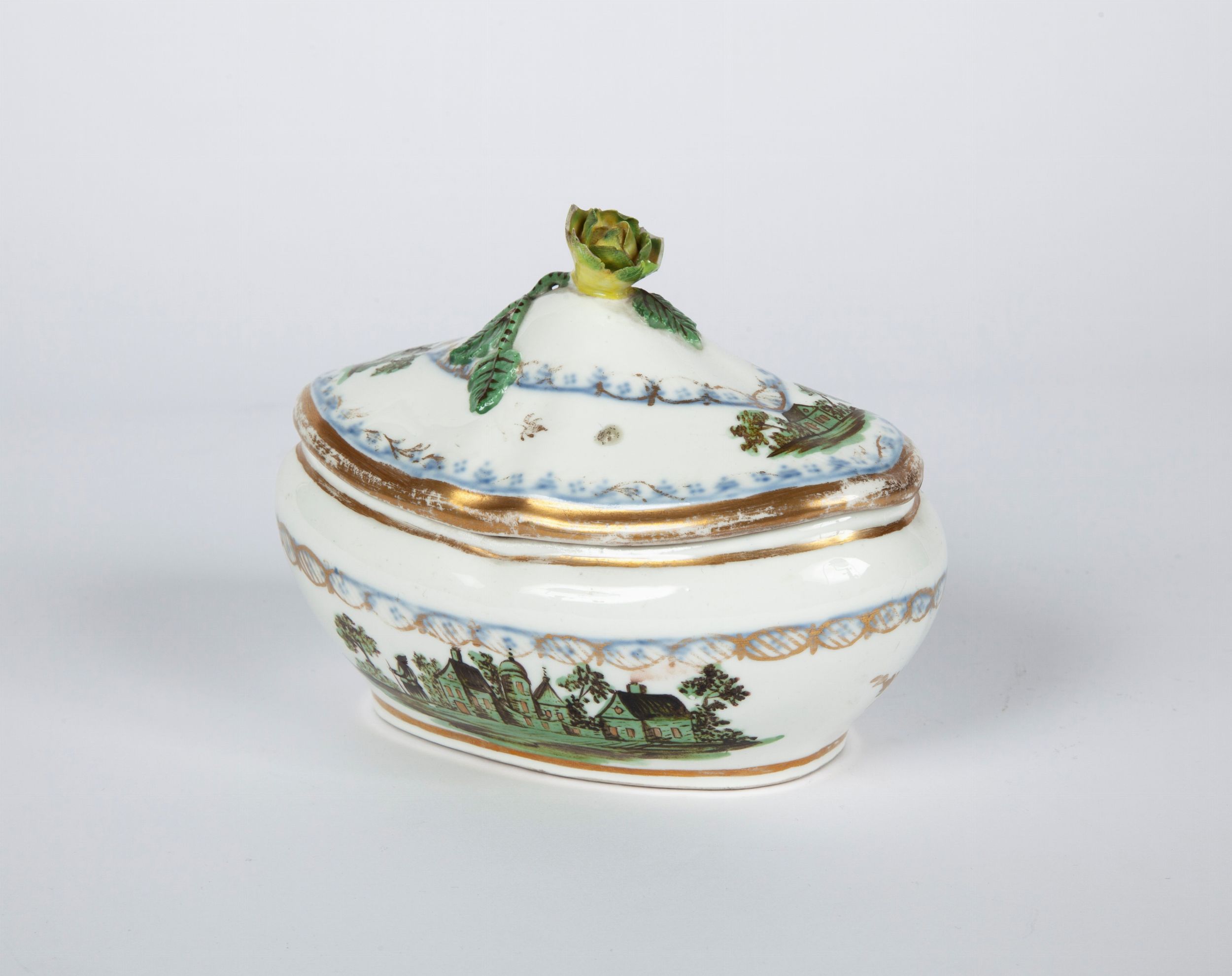 di forma ovale lievemente irregolare, decorata da villaggi dipinti in monocromia verde; coperchio con presa in forma di fiore
