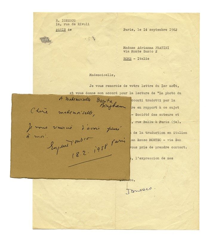 Manoscritto a penna nera su cartoncino beige. Dimensioni 150x100 mm. SI AGGIUNGE: Id.: Lettera dattiloscritta in francese con firma autografa. Datata 14 septembre 1962 e scritta da Parigi, Rue de Rivoli 14, residenza di Ionesco tra il 1960 e il 64.