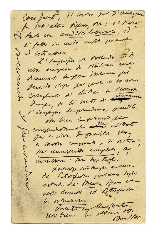 Manoscritto a inchiostro nero. Cartolina con intestazione La Critica. Francobolli conservati. Dimensioni 90x140 mm.