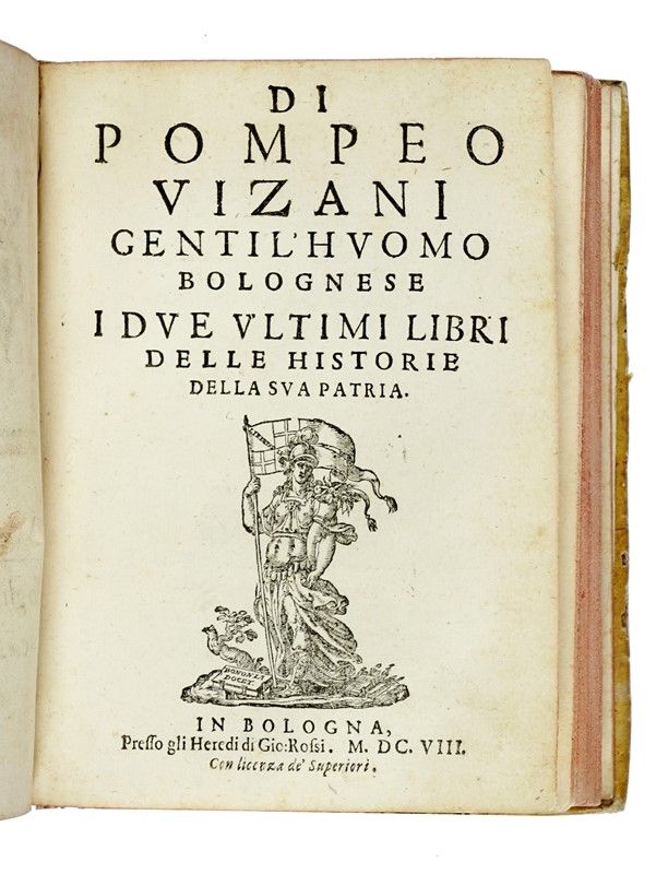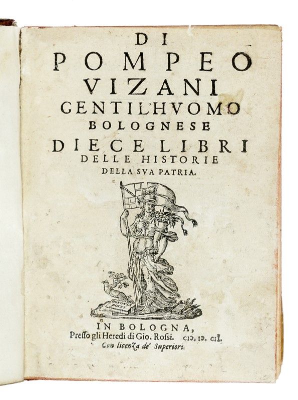 In-4° (mm 188x141). Pagine [44], 556, [4]. Le carte P3-R3 assenti, supplite da facsimili. Marca editoriale xilografica "Bononia docet" al frontespizio e alla carta 3†6v. Emblema xilografico dell'autore "Sibimet pulcherrima merces" a carta †2v e a carta 2M7r. Vignetta in legno alla carta 2M8v. Testatine, capilettera abitati e finalini in legno nel testo. Fioriture concentrate ad alcune carte, gora d'acqua al margine esterno degli ultimi fascicoli. LEGATO CON: Id., ...Gentil'huomo bolognese i due ultimi libri delle Historie della sua patria. In Bologna: presso gli heredi di Gio. Rossi, 1608. Pagine [32], 180. Marca editoriale xilografica "Bononia docet" al frontespizio, emblema xilografico dell'autore "Sibimet pulcherrima merces" a carta 4†4v. Testatine, capilettera abitati e finalini in legno nel testo. Gora d'acqua al margine esterno di alcuni fascicoli. Legatura in mezza pergamena con piatti in carta marmoirizzata e titoli in oro su tassello in pelle al dorso. Mancanze alla unghiature.Tagli rossi.