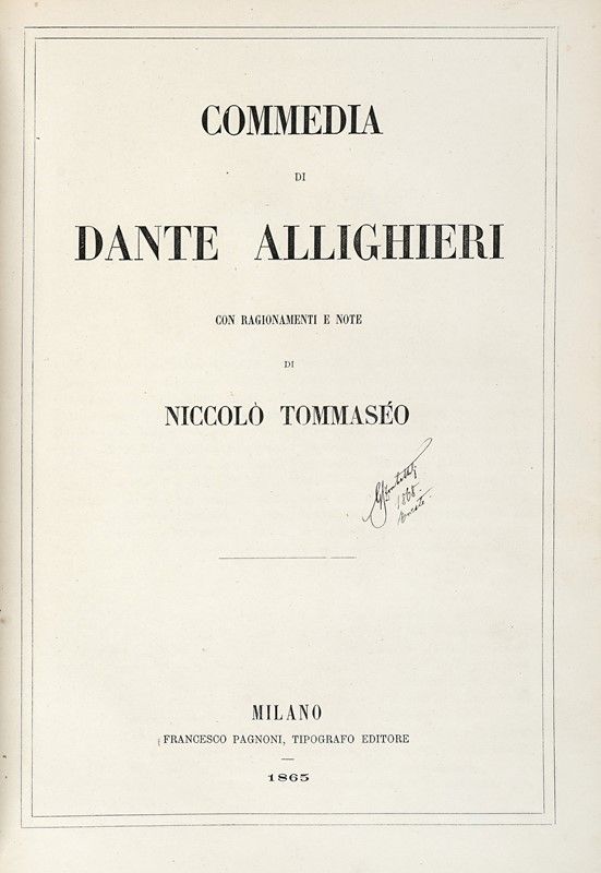 3 volumi in-4° (mm 330x235). Con belle tavole in rame fuori testo. Bruniture alle veline protettive, altrimenti buono stato di conservazione. Legatura in mezza pelle, con piatti in carta marmorizzata e titoli in oro al dorso a 4 nervi. Staccati i dorsi del primo e terzo volume. SI AGGIUNGONO: Tommaseo Niccolò, Studi critici. Venezia: Giorgio Andruzzi, 1843; Alighieri Dante, Commedia [...]. Con ragionamenti e note di Niccolò Tommaseo. Milano: Giuseppe Rejna, 1854. La prima e la terza opera presentano difetti visibili alla legatura. Lotto non passibile di restituzione.