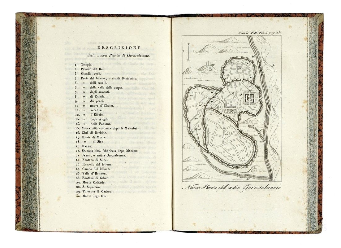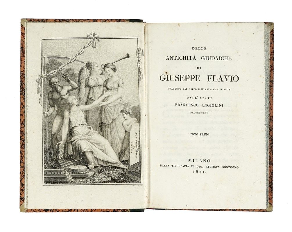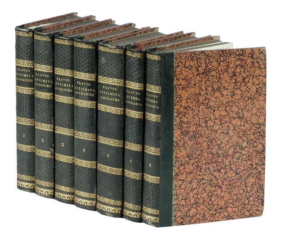 5 volumi in-8° (mm 205x130). Con numerose tavole in rame fuori testo, molte delle quali ripiegate. Fioriture sparse, ma nel complesso buona conservazione. SI AGGIUNGE: Id., Storia della guerra giudaica [...] Tomo primo (-secondo). Milano: Sonzogno, 1822. Legatura omogena coeva in mezza pelle, con piatti in carta marmorizzata, titoli e fregi in oro a dorso. Minimi segni di usura.