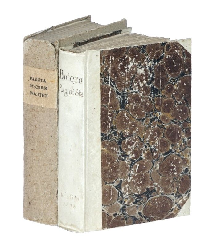 In-8° (mm 161x105). Pagine [40], 504. Marca calcografica al frontespizio. Alcune fioriture e strappi marginali ma testo completo. Legatura successiva in pieno cartonato con titolo su pecetta cartacea al dorso. SI AGGIUNGE: Botero Giovanni, Della ragione di stato, libri dieci. In Venetia: appresso i Gioliti, 1598. In-8° (mm 154x105). Pagine [20], 375, 1 bianca. Copia con alcune gore. Legatura successiva in mezza pergamena con punte e piatti in carta marmorizzata. Titolo manoscritto al dorso.