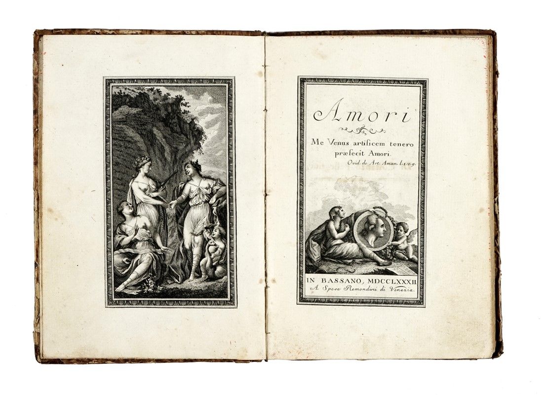 In-8° (mm 192x125). Antiporta e frontespizio incisi. Alcune fioriture. Legatura successiva in pieno cartonato muto. SI AGGIUNGE: Amori me venus artificem tenero praefecit amori. In Bassano: a spese Remondini di Venezia, 1782.