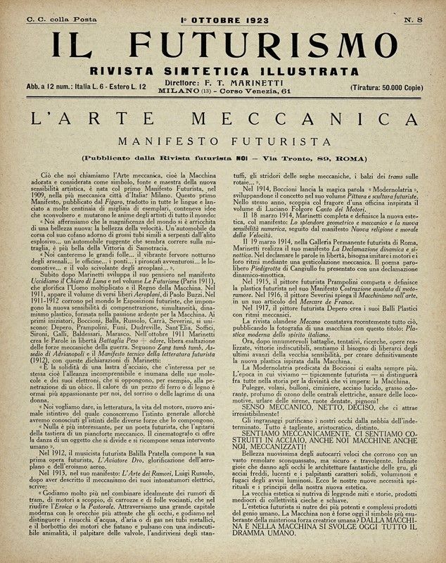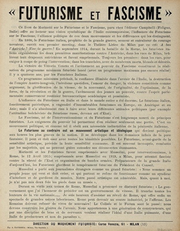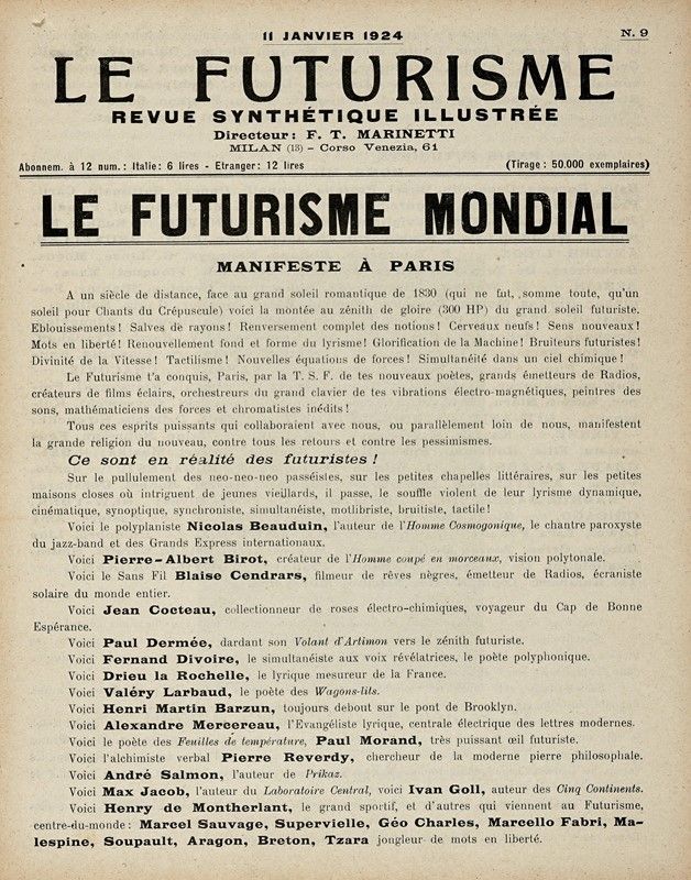 In-4° (mm 295x236). Carte [2]. Lievissime fioriture e bruniture marginali. SI AGGIUNGE: Marinetti Filippo Tommaso, Le Futurisme. Revue synthétique illustrée. Le Futurisme mondial. Manifeste à Paris. [Segue:] Futurisme et Fascisme. Milano: Direction du Mouvement Futuriste. 11 janvier 1924. In-4° (mm 290x230). Carte [2]. Uno strappetto senza perdite al margine superiore della prima carta, altrimenti ottima copia.