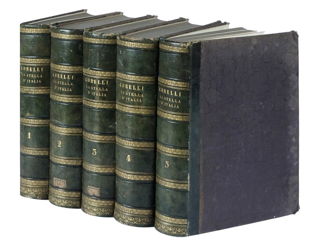 5 volumi in-4° piccolo (mm 270x185). Con moltissime tavole a piena pagina disegnate da Masutti e incise su acciaio da Carelli, Clerici, Buccinelli etc... Fioriture sparse, staccato l'occhietto al primo volume, altrimenti buona conservazione. Legatura coeva in mezza pelle, con piatti in sera e titoli in oro al dorso. Abrasioni ai piatti e al dorso e una mancanza alla cerniera posteriore del quarto volume.