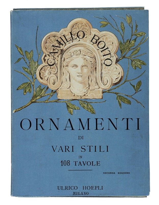 Cartella in-folio (mm 380x250). Contiene numerose illustrazioni, di cui molte a colori e fuori testo. Cartella editoriale in percallina azzurra con titoli impressi in oro al piatto anteriore. SI AGGIUNGE: Id., L'arte del fabbricare, parte seconda. Roma, Milano, Napoli: A. Vallardi, [1891]. Cartella in-folio (mm 380x250). Contiene numerose illustrazioni, di cui molte a colori e fuori testo. Cartella editoriale in percallina con titoli impressi in oro al piatto anteriore. Staccati il piatto anteriore e i lembi della cartella. SI AGGIUNGE: Boito Camillo, Ornamenti di diversi stili. Milano: Ulrico Hoepli, 1895. Cartella in-folio (mm 350x250). Cartella originale in tela blu con illustrazione a colori al piatto anteriore.