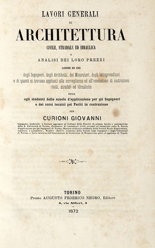 In-8° (mm 235x145). Lievi fioriture altrimenti ottimo stato di conservazione. Mezza pelle coeva con titoli in oro al dorso a 4 nervi. Minime abrasioni. SI AGGIUNGONO: Id., La resistenza dei materiali [...] studio del progetto di un tronco di strada ferrata... Torino: Augusto Federico Negro, 1873. 1 volume di testo e 1 volume di tavole in-8° (mm 235x145). SI AGGIUNGE: Id., Operazioni topografiche... Torino: Augusto Federico Negro, 1869. In-8° (mm 235x145). SI AGGIUNGE: Id., Geometria pratica applicata all'arte del costruttore... Torino: Augusto Federico Negro, 1868. In-8° (mm 235x145). SI AGGIUNGE: Id., Costruzioni civili, stradali ed idrauliche... Torino: Augusto Federico Negro, 1870. In-8° (mm 235x145).