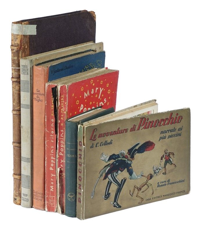 In-8° oblungo (mm 165x240). Con illustrazioni in nero nel testo e tavole a colori fuori testo. Difetti. Legatura editoriale con illustrazioni e titoli al piatto e al dorso. Marcanze alle cerniere e altre minime mende. SI AGGIUNGONO: Compongono il lotto: 1) De Amicis Edmondo, Cuore. Milano: Treves, 1940; 2) Scalarini Chiabov Virginia, Le avventure di Miglio. Milano: Antonio Vallardi Editore, 1933; 3) Milton John, Il Paradiso Perduto [...] tradotto da Lazzaro Papi. Milano: Sonzogno, 1881, 4) Tibaldi Chiesa Mary, L'uccello di fuoco e altre fiabe popolari Russe. Milano: Italgeo, 1945, 5) Lyndon Travers Pamela, Mary Poppins ritorna [...] Illustrato da Mary Shepard. Milano: Valentino Bompiani, 1943; 6) Lyndon Travers Pamela, Mary Poppins [...] Illustrato da Mary Shepard. Milano: Valentino Bompiani, 1943.