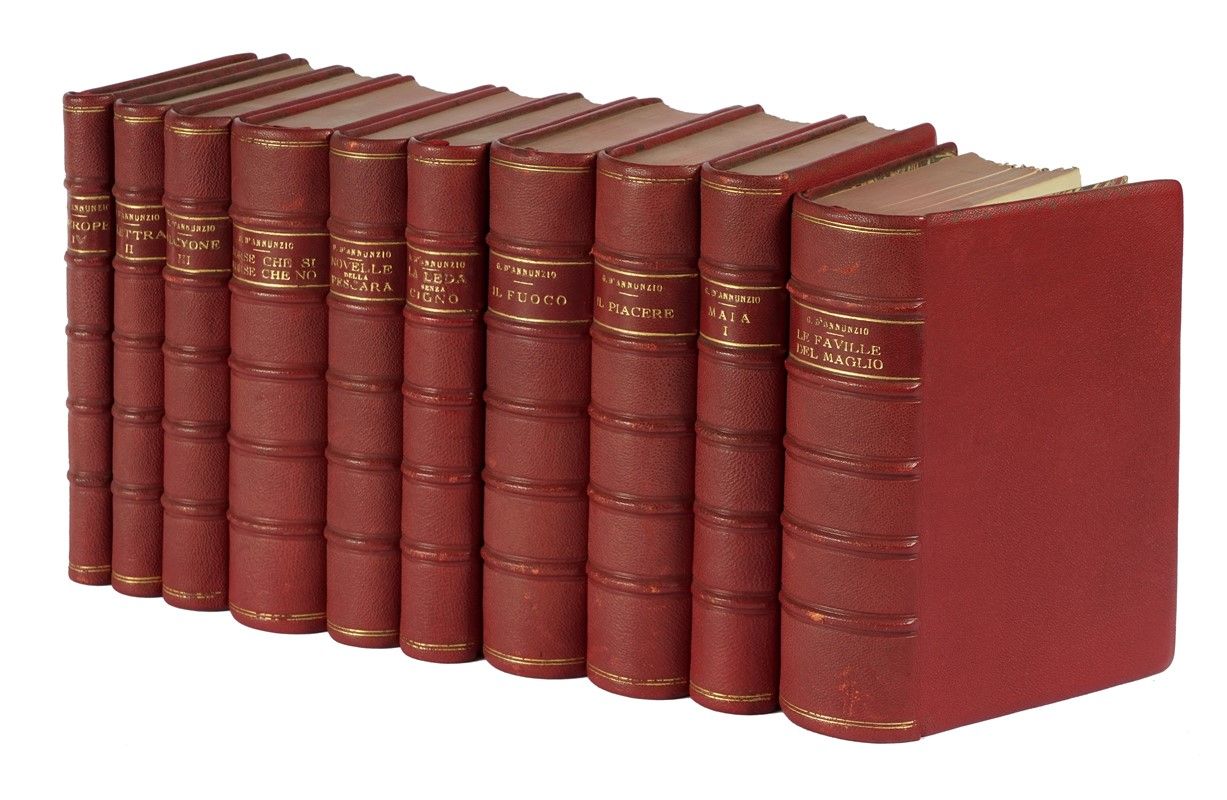 Compongono il lotto: 1) D'Annunzio Gabriele, Merope [...] Libro quarto. Il Vittoriale degli italiani, 1939. 2) Id., La Leda senza cigno... Il Vittoriale degli Italiani, 1939. 3) Il fuoco... Il Vittoriale degli Italiani, 1939. 4) Id., Alcyone […] Libro terzo. Il Vittoriale degli Italiani, 1939. 5) Id., Elettra […] Libro secondo. Il Vittoriale degli Italiani, 1939. 6) Id., Maia […] Libro primo. Il Vittoriale degli Italiani, 1939. 7) Le faville del maglio... Il Vittoriale degli Italiani, 1939. 8) Id., Forse che sì forse che no. Il Vittoriale degli Italiani, 1939. 9) Id., Novelle della Pescara. Il Vittoriale degli Italiani, 1940. 10) Id., Il piacere... Il Vittoriale degli Italiani, 1939.