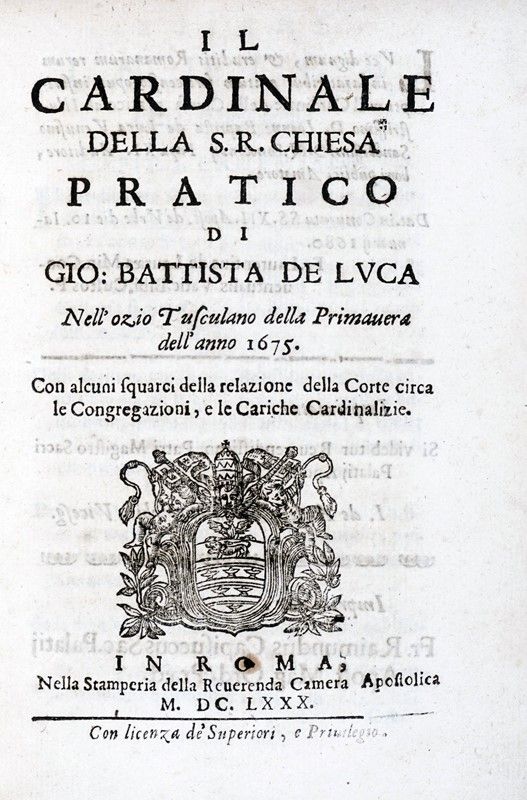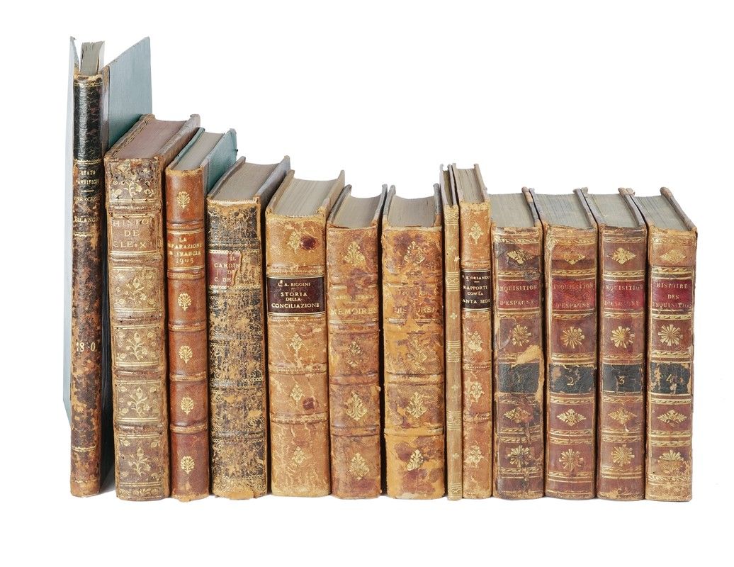 Compongono il lotto: 1) Llorente Jean-Antoine, Histoire critique de l'inquisition d'Espagne. Tome premier (-IV). A Paris: Treutiel et Wertz, 1817. 4 volumi. 2) De Luca Giovanni Battista, Il cardinale della S.R. Chiesa pratico [...] nell'ozio tusculano della primavera dell'anno 1675. Roma: Reverenda Camera Apostolica, 1680. 3) Reboulet, Histoire de Clement XI Pape. Tome premier. A Vignon: Delormé, 1752. 4) Stato Pontificio. Bilancio generale della Pubblica Amministrazione per l’esercizio 1860. Roma: Tipografia Rev. Cam. Apostolica, 1863. 5) Ceresole Ambrogio monaco cistercense, Notizie storico-morali sopra gli Agnus Dei. Roma: Salviucci, 1845. 6) Don Pasquale de Franciscis, Discorsi del sommo pontefice Leone XIII ai fedeli di Roma e dell'Orbe. Volume primo. Roma: Ghione e Lovesio, 1882. 7) Biggini Carlo Alberto, Storia inedita della conciliazione. Garzanti, s.d. 8) La separazione dello Stato della Chiesa in Francia. Roma: tipografia Vaticana, 1905. 9) Cardinal Dominique Ferrata, Mémoires ma nonciature en France. s.d.e. 10) Orlando V.E., Su alcuni miei rapporti di Governo con la Santa Sede. Note e ricordi. Napoli: Sabina, 1930.
