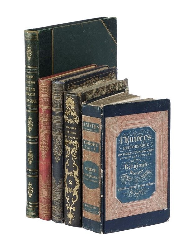 Compongono il lotto: 1) Brackenbury George, The Campaign in the Crimea: an historica sketch... London: Colnaghi and Co., 1855. 2) D'Orbigny M. Alcide, Voyage pittoresque dans les deux Amériques... A Paris: L. Tenré, 1836. 3) Dumont D'Urville M., Voyage pittoresque autour du monde [...] Tome premier (-second). A Paris: L. Tenré, 1834-35. (2 voll.) 4) Galibert M. Léon, L'Algérie ancienne et moderne... Paris: Furne et Cie, 1861. 5) Malte-Brun Conrad, Géographie universelle ou description de toutes les parties du monde [...] Tome premier (-sixième). Paris: Furne et Cie, 1841. (6 voll.). Elenco completo disponibile su richiesta.