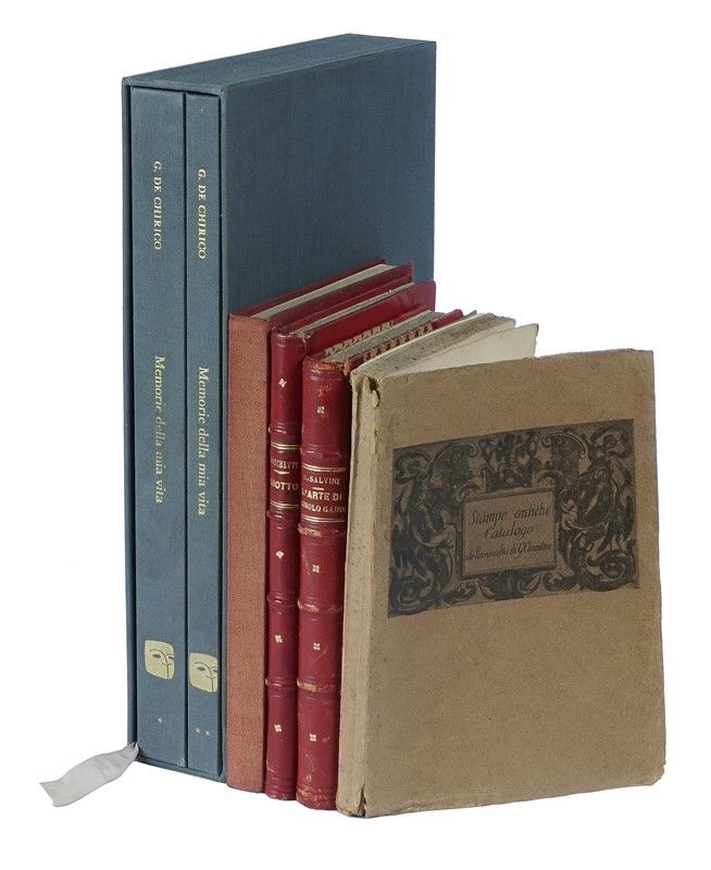 Compongono il lotto: 1) Cordaro Michele, Morandi. L'opera grafica... Milano: Electa, 1990. 2) Del Guercio Antonio, Renato Guttuso. I disegni dell'amore. Milano-Roma: Domus, 1974. 3) De Chirico Giorgio, Memorie della mia vita [...] Fastigio Di Italo Calvino. Volume 1 (-2). La Bautta, 1985. (2 voll.) 4) Pallucchini Rodolfo, Mostra di Paolo Veronese... Venezia: Ca' Giustinian, 1939. 5) Plon Eugène, Benvenuto Cellini. Orfèvre médailleur, sculpteur... Paris: E. Plon et Cie, 1883. Elenco completo disponibile su richiesta.