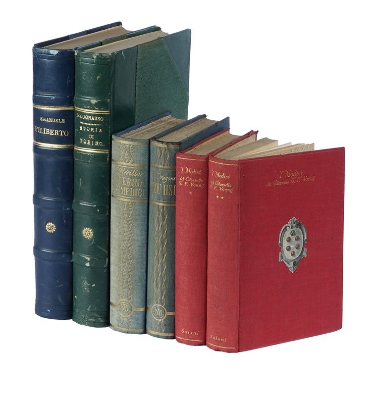 Compongono il lotto: 1) Nibby A., Itinerario di Roma e delle sue vicinanze [...] Tomo I (-II). Roma: Aurelj, 1830. (2 voll.) 2) Meyer Edoardo, Storia dello antico Egitto […] Tomo primo (-secondo). Milano: Soc. Editrice libraria, s.d. (2 voll.) 3) Clementi Filippo, Il carnevale romano [...] Parte I (-II). Città di Castello: R. O. R. E., 1939. (2 voll.) 4) Faure Gabriel, Il Volto d'Italia [...] Prefazione di Benito Mussolini... A Parigi: Horizons de France, 1929. 5) Menghini Mario, La spedizione garibaldina di Sicilia e di Napoli... Torino: Soc. Tip.-Editrice Nazionale, 1907. Elenco completo disponibile su richiesta.