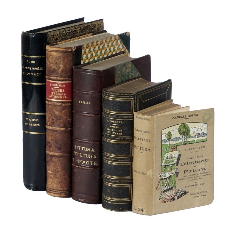 Compongono il lottto: 1) Costantini Vincenzo, Pittura italiana contemporanea dalla fine dell'800 ad oggi. Milano: Hoepli, 1934. 2) Melani Alfredo, L'arte di distinguere gli stili... Milano: Hoepli, 1921. 3) Müntz Eugenio, L'età aurea dell'arte italiana... Milano: Corriere della Sera, 1895. 4) Marangoni Matteo, Saper vedere. Come si guarda un'opera d'arte... Milano: Treves, s.d. 5) Winckelmann Giovanni, Monumenti antichi inediti... Roma: Mordacchini, 1821. Elenco completo disponibile su richiesta.