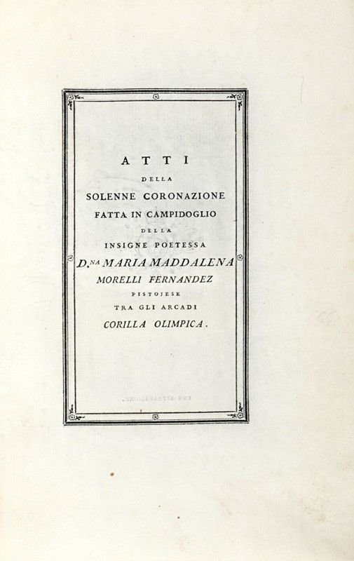 Compongono il lotto: 1) Anacreon, Anakreontos Teiou Mele Anacreontis Teii Odaria praefixo commentario... Parmae: ex regio typographeio, 1785. 2) Atti della solenne coronazione fatta in campidoglio della insigne poetessa Maria Maddalena Morelli Fernandez... (Al colophon:) Impresso nella stamperia reale di Parma: 1779.