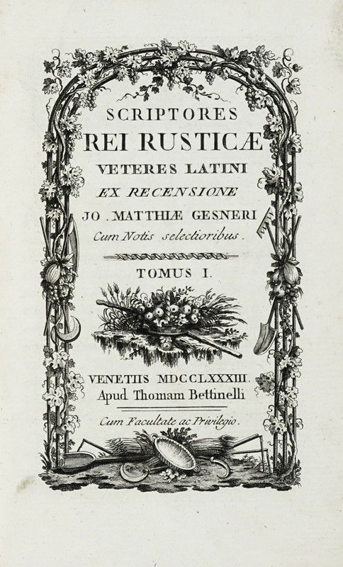 Compongono il lotto: 1) Gesner Johann Matthias, Scriptores rei rusticae veteres latini. Tomus I (-V). Venetiis: Bettinelli, 1783. 5 volumi. 2) Cugnot M., Le fortification de campagne theorique et pratique. A Paris: Jombert, 1769. 3) Lo spettacolo della natura esposto in vari dialoghi concernenti la storia naturale... Tomo primo. In Venezia: Paquali, 1777. 2 parti in 1 volume.