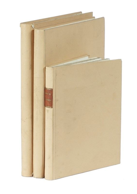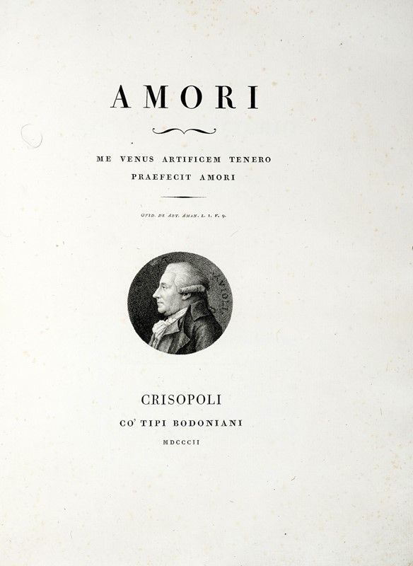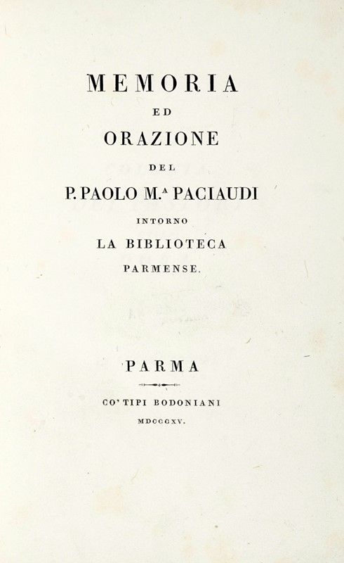 Compongono il lotto: 1) Paciaudi, Memoria ed orazione [...] intorno la biblioteca parmense. Parma: co' tipi bodoniani, 1815. 2) Monti Vincenzo, Il bardo della selva nera. Parte prima (unica pubblicata). Parma: co' tipi bodoniani, 1806. 3) Savioli Ludovico Antonio, Amori me venus artificem tenero praefecit amori. Crisopoli: co' Tipi Bodoniani, 1795.