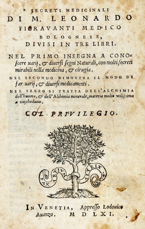 Compongono il lotto: 1) Fioravanti Leonardo, Secreti medicinali. Venezia: Lodovico Avanzo, 1561. 2) Id., Il reggimento della peste. Venezia: eredi Melchiorre Sessa, 1594. 3) Rossello Timoteo, [Della summa de' secreti uniuersali in ogni materia]. Parte prima (-seconda). Venezia, Bariletto, 1565. 2 parti in 1 volume. Acefala la prima parte. 4) Tagavultio Giovanni, Institutione di cirurgia... Venezia: Angelieri, 1570.