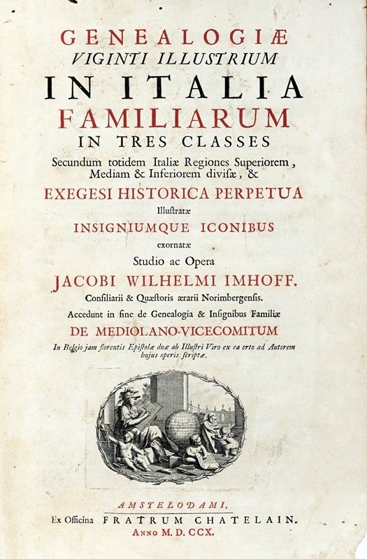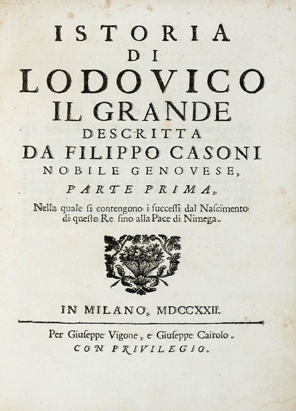 Compongono il lotto: 1) Simmaco Mazzocchi Alessio, In mutilum Campani amphitheatri titulum aliasque nonnullas Campanas inscriptiones commentarius... Neapoli: Ex Regio Typographio Vincentii Ursini, 1797. 2) Casoni Filippo, Istoria di Lodovico il Grande... Parte prima (-terza). In Milano: Giuseppe Vigone, 1722. 3 volumi. 3) Imnhoff Jacopi Willhelm, Genealogiae viginti illustrium in Italia Familiarum in tres classes [...] divisae. Amstelodami: Fratrum Chatelain, 1710. 4) Linguet, Annali Politici e Letterari del secolo XVIII (Cronaca di un esule francese per motivi politici). Tomo secondo (-XII). All'Haya: Filippo Stecchi, 1778. 11 volumi di 12 (manca il primo). 5) Contarini Camillo, Annali delle Guerre d’Europa per la monarchia delle Spagne. Parte prima (-seconda). Venezia: Coleti Malachin, 1720. 2 volumi.