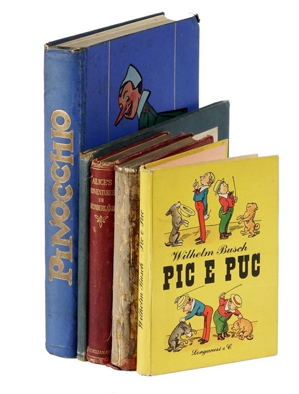 Compongono il lotto: 1) Carroll Lewis [pseud. di Dodgson Charles Lutwidge], Alice's adventures in Wonderland. With forty-two illustrations by John Tenniel. London: Macmillan and co, 1881. 2 volumi. 2) Id., Through the looking-glass, and what Alice found there [...] with fifty illustrations by John Tenniel. London: Macmillan & co, 1872. 3) Collodi Carlo, Le avventure di Pinocchio [...]. Disegni a colori di Attilio Mussino. Sesta edizione in ottavo. Firenze: R. Bemporad & Figlio, [1934].4) Busch Wilhelm, Pic e Puc. 141 figure a colori. Milano: Longanesi e C., 1947. 5) Ghiron Ugo, Nel regno delle bestie. Ricche tavole a colori per fanciulli con 12 poesie. Bergamo: istituto italiano d'arti grafiche, 1909.