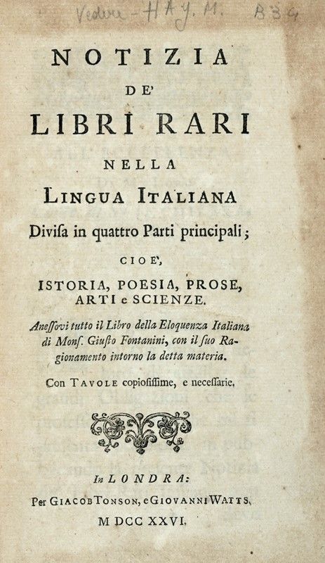Compongono il lotto: 1) Fournier F. I., Dictionnaire portatif de Bibliographie... Paris: Fournier frères, 1805. 2) Dimier Louis, La gravure. Paris: Garnier freres, 1930. 3) Malo-Renault Jean, L'art du livre. Paris: Garnier freres, 1931. 4) Calvalcaselle G.B. & Crowe J.A., A new history of painting in Italy from the second to the sixteenth century. Vol I (-II). London: Murray, 1864. 2 volumi. 5) Haym Nicola Francesco, Notizia dei libri rari nella lingua italiana divisa in quattro parti principali: historia, Poesia, Prosa , Arti e Scienze... Londra: per Giacob Tonson e Giovanni Watts, 1726. 6) Tooley R.V., Maps and Map’s Makers. London, New York, Toronto, Sidney: Batsford, 1949. 7) Bibliographie instructive ou traité de la connoissance des livres rares et singuliers. A Paris: chez De Bure, 1768. 10 volumi: Histoire (3 volumi), Theologie (1 volume), Jurisprudence et sciences et arts (1 volume), Belles lettres (2 volumi), Supplement (2 volumi), Tome dixieme in edizione 1782.