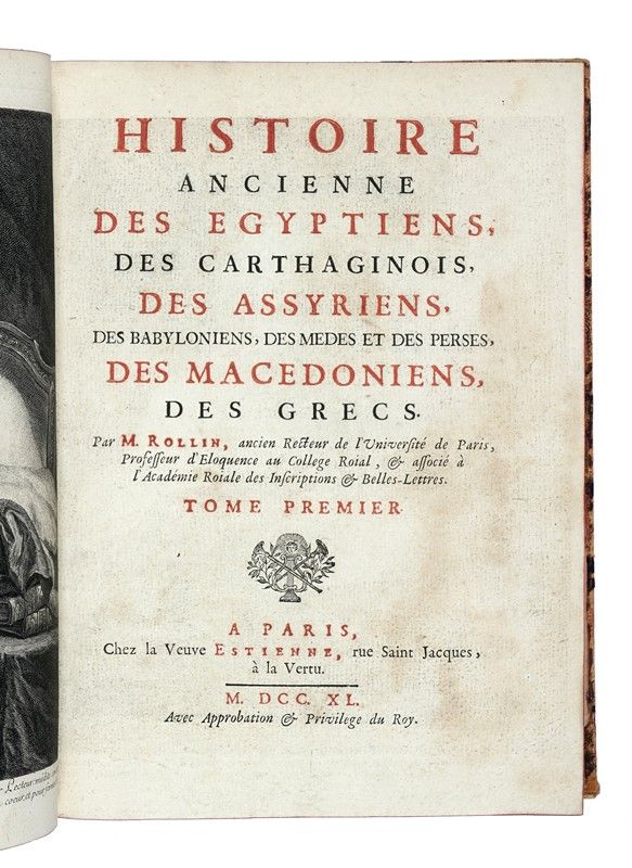 Compongono il lotto: 1) Rollin M., Histoire ancienne des Egyptiens, des Carthaginois… Tome premier (-VI). A Paris: Estienne, 1740. 6 volumi. Legatura con piatti staccati. 2) Relation de la Cérémonie du Sacre et couronnement du Roi faite en l’Eglise de Reims le dimanche 25 octobre 1722. A Paris: du Bureau d'Adresse, s.d... 3) Dubois, Détails de la fete nationale du 14 jullet 1790 arretés par le roi. 4) Instructions adressées par Sa Majesté l'Impératrice de toutes les Russies... Petersbourg, 1769. 5) Recueil des pieces les plus interessantes [...] qui ont paru a l'occasion du voyage et du séjour de sa sainteté Le Pape Pie VI a Vienne. Vienne: 1783. 6) Resources contre l'ennui ou choix d’anecdotes et de bons mots... Tome premier (-seconde). La Haye, Paris: Duchesne, 1771. 2 parti in 1 volume.