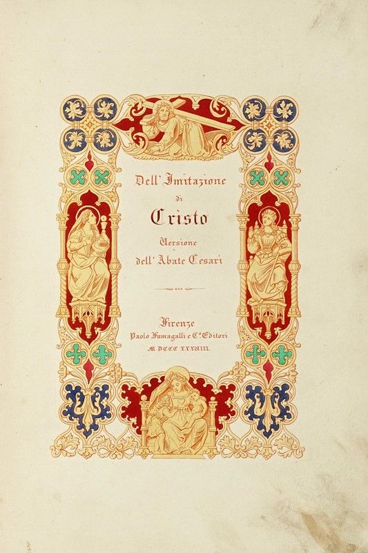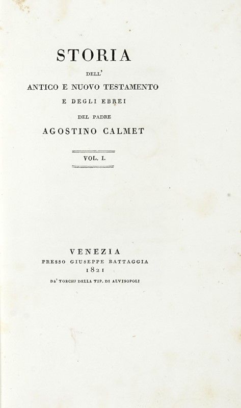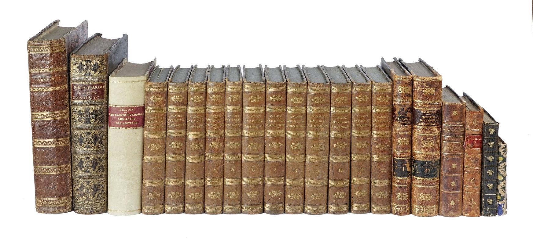 Compongono il lotto: 1) Calmet Agostino, Storia dell'Antico e Nuovo Testampento e degli ebrei. Vol I (-XII). Venezia: Battaggia, 1821. 12 volumi. 2) Baumgartner Reinhardo, Conclusiones ex quinque libris decretalium deductae. Pars prima (-altera). Romae: Salomoni, 1759. 2 parti in un volume. 3) Uffizio della B.V. Maria de' morti, dello Spirito santo... Roma: Perego Salvioni, 1821. 4) Costumi religiosi e militari della Corte Pontificia. Roma: Cuccioni. s.d. 5) Martinucci Pius, Manuale sacrarum caeremoniarum in libros octo digestum. Ratisbonae - Roma, 1914. 2 volumi. 6) Consuetudini di cerimoniale. Roma, 1936. 7) De Chantal Madame, Lettres de Saint François de Sales. Paris: Garnier, 1892. 8) Cesari (Abate), Della imitazione di Gesù Cristo. Firenze: Fumagalli, 1838. 9) La Sainte Bible. Tome VII. Paris: Letouzey et ané, 1912.