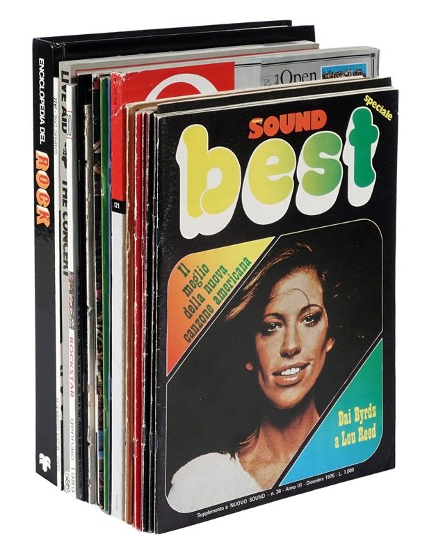 Compongono il lotto: 1) Logan Nick, Enciclopedia del Rock. Milano: Fratelli Fabbri Editori, 1977; 2) Cane Giampiero, Jazz. America in nero e bianco. Firenze: Giunti Barbera, 1987; 3) Hillmore Peter, The greatest show on earth. Live aid. London: Sidgwick & Jackson, 1985; 4) Rockstar numero Uno. Tutto Rolling. Anno 1, settembre 1980; 5) Rockstar 100! Speciale i Cento dischi degli anni Ottanta. Gennaio 1989; 6) La musica giovane: racconto e mito di una rivoluzione. Pop, rock, punk di Renzo Arbore, Francesco Russo, Dario Salvadori. Suppl. al n. 40 dell'Espresso 9 ottobre 1977. Elenco completo disponibile su richiesta. Lotto non passibile di restituzione.