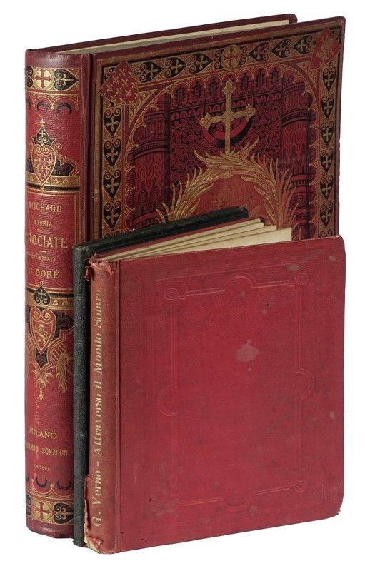 Compongono il lotto: 1) Verne Jules, Attraverso il mondo solare. Avventure di Ettore Servadac. Milano: Sonzogno, 1891; 2) Poe Edgar Allan, Racconti incredibili... Milano: Lombarda editrice, 1876; 3) Michaud Joseph François, Storia delle Crociate [...] adorna di cento grandi composizioni di Gustavo Doré. Milano: Edoardo Sonzogno, 1878. Le opere presentano difetti.