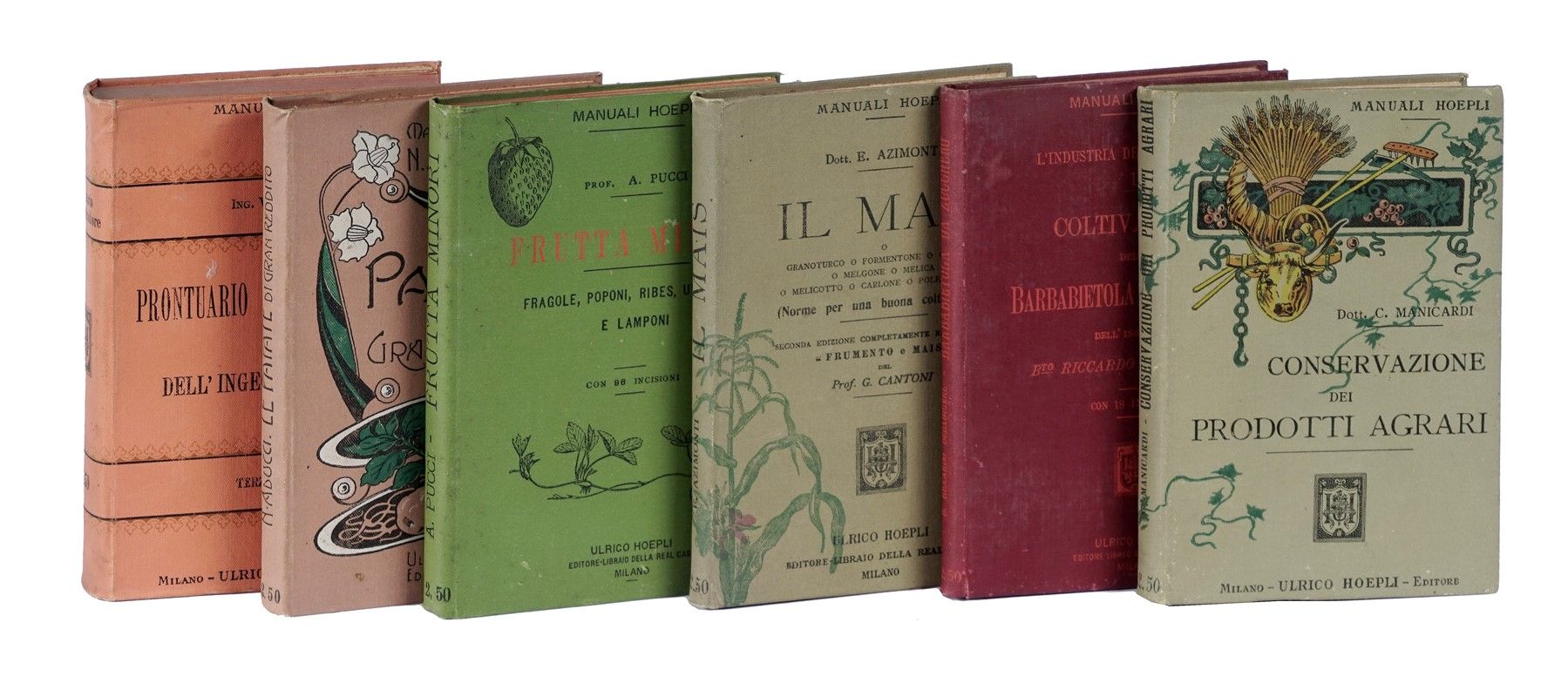 Compongono il lotto: 1) Niccoli Vittorio, Prontuario dell'agricoltore e dell'ingegnere rurale... Milano: Ulrico Hoepli, 1903; 2) Aducci Noel, Le patate di gran reddito... Milano: Ulrico Hoepli, 1904; 3) Pucci Angiolo, Frutti minori. Fragole, poponi, ribes, uva spina e lamponi... Milano: Ulrico Hoepli, 1895; 4) Azimonti Eugenio, Il mais o granoturco o formentone o granone [...] edizione completamente rifatta del Frumento o Mais... Milano: Ulrico Hoepli, 1902; 5) Debarbieri Riccardo, Coltivazione della barbabietola da zucchero... Milano: Ulrico Hoepli, 1899; 6) Manicardi Cesare, Conservazione dei prodotti agrari... Milano: Ulrico Hoepli,1905.