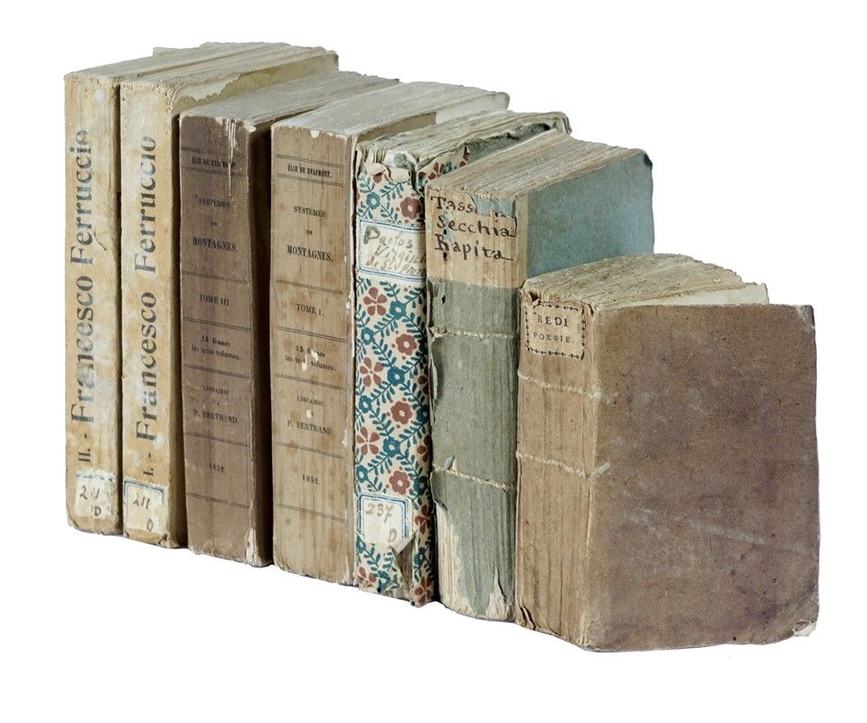 Compongono il lotto: 1) Beaumont Léonce Élie (de), Notice sur les systèmes de Montagnes [...]. Tome I (-III). Paris: Bertrand, 1852; 2) Redi Francesco, Poesie toscane. Firenze: Riccardo Tondini, 1816; 3) Tassoni Alessandro, La secchia rapita. Pisa: Sebastiano Nistri, 1814; 4) Guerrazzi Francesco Domenico, Vita di Francesco Ferrucci. Vol. I (-II). Milano: M. Guigoni, 1875.