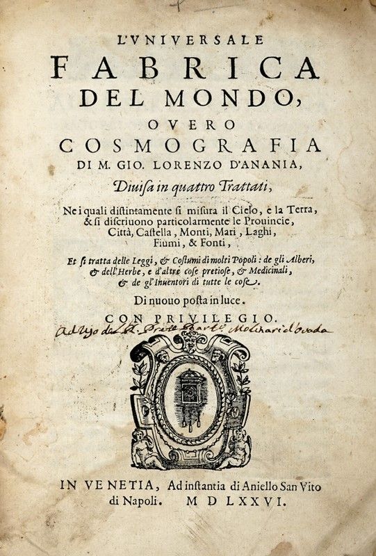 In-4° (mm 225x160). Pagine [24], 336, [32]. Copia con alcune gore, un lavoro di tarlo nel margine interno della metà dei fascicoli, alcune macchie, altri marginali difetti. Legatura successiva in cartonato con dorso rinforzato e titolo manoscritto su pecetta cartacea, recentemente aggiunto.