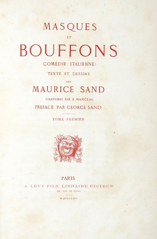 2 volumi in-4° (mm 275x185). Pagine III-VIII, 356, [4] con 25 tavole a piena pagina fuori testo, in parte a colori; [4], 384 con 25 tavole a piena pagina fuori testo, in parte a colori. Nel complesso, 50 tavole incise da Alexandre Monceau su disegni di Sand raffiguranti le maschere della Commedia dell'Arte. Frontespizi stampati in rosso con piccola vignetta incisa. Alcuni strappetti e fioriture marginali. Legatura coeva in mezza pelle con piatti in carta marmorizzata e titoli in oro al dorso. Piccole spellature lungo le unghiature.