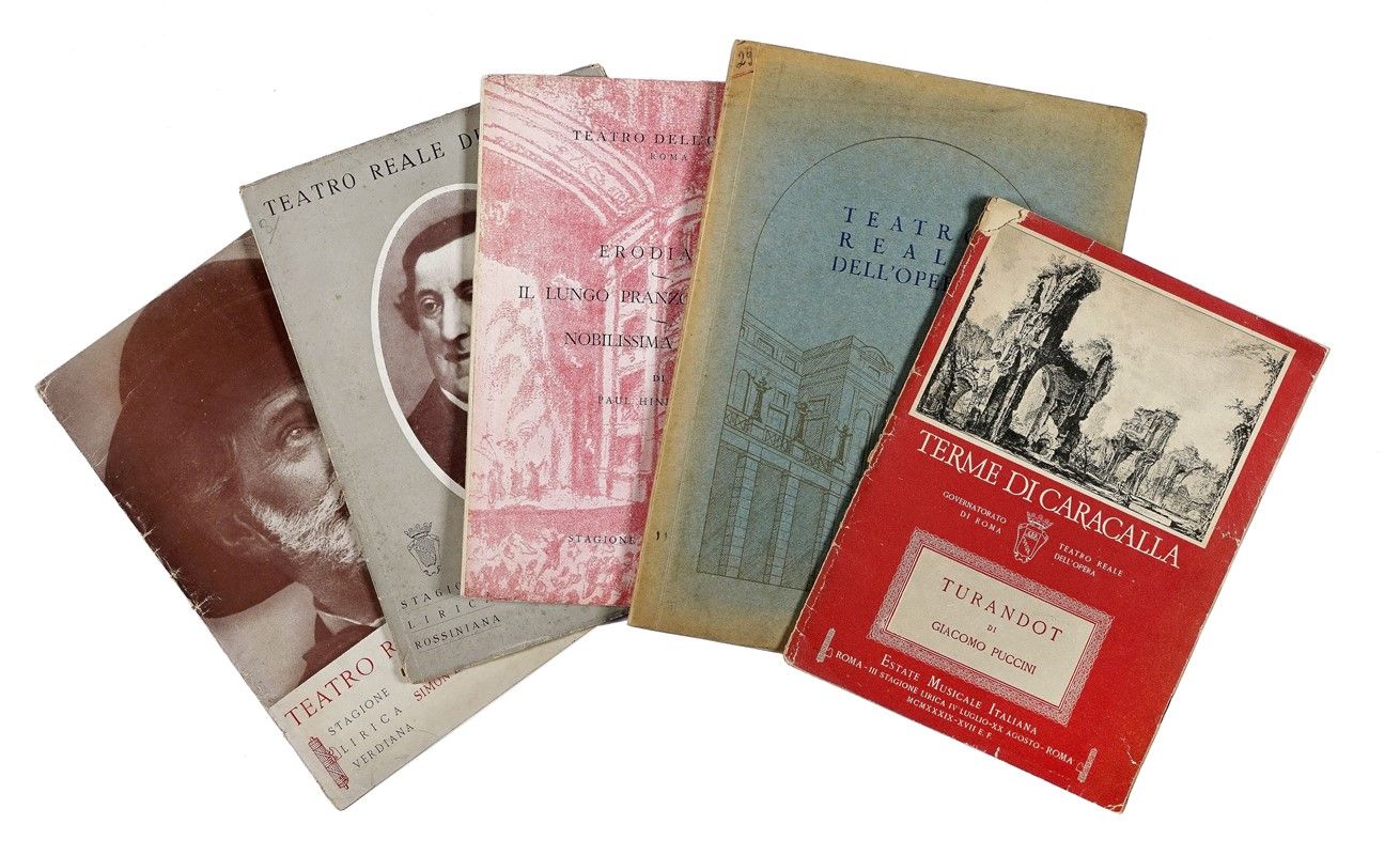 I libretti sono del Teatro la Fenice di Venezia, Teatro Massimo di Palermo, Teatro Regio di Parma, Teatro dell’Opera di Roma, Teatro Comunale di Trieste, Teatro Comunale di Bologna, Teatro Comunale di Modena etc. Insieme anche un volumetto del Teatro alla Scala dal titolo Giro artistico della Gran Bretagna del 1950.