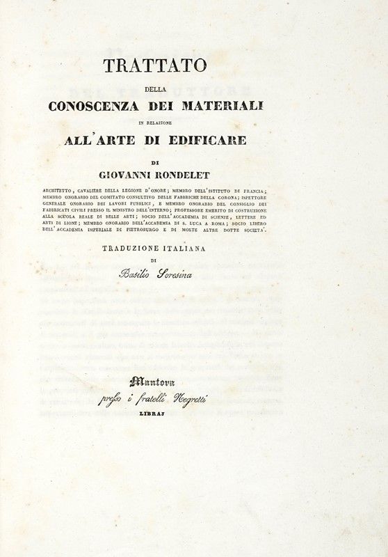 In-4° (mm 305x225). Lievi fioriture sparse, altrimenti ottimo esemplare in barbe. Legatura coeva in mezza pelle, con piatti marmorizzati e titoli in oro al dorso. Abrasioni e altre minime mende. SI AGGIUNGE: Id., Trattato delle costruzioni in pietre di taglio e della sterotomia... Mantova: presso i Fratelli Negretti, s.d. [i.e. dopo 1830]. 1 volume di testo e 1 volume di tavole in-4° (mm 305x225). Legatura omogenea in mezza pelle, con piatti marmorizzati e titoli in oro al dorso. Lievi difetti.