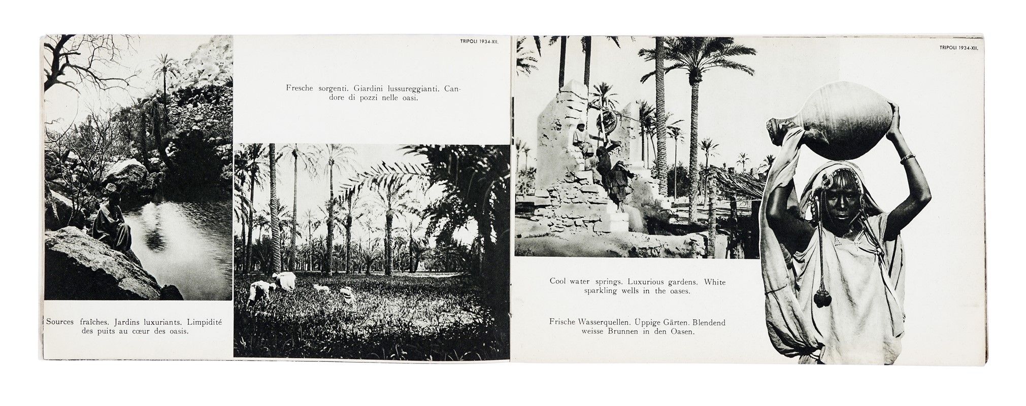 In-8° oblungo (mm 164x235). Pagine [32]. Testo impresso a più lingue. Contiene numerose fotografie con ritratti e vedute di scorci e persone tripolini. Brossura editoriale impressa a colori, leggera ingiallitura omogenea.