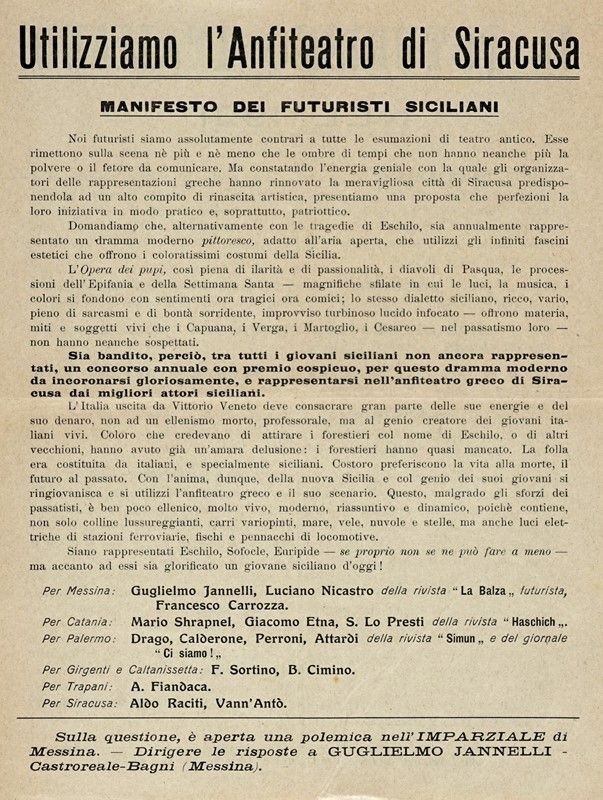 In-4° (mm 295x230). Carta [1]. Segni centrali di precedente piegatura e rarissime fioriture. Al verso: Il futurismo italiano nel 1921. Milano: Direzione del Movimento Futurista, s.d. Con le notizie relative al tattilismo, alla mostra di Avanguardia di Ginevra di Boccioni, all'Arte decorativa Futurista di Balla, ai quadri di stoffa di Depero etc...