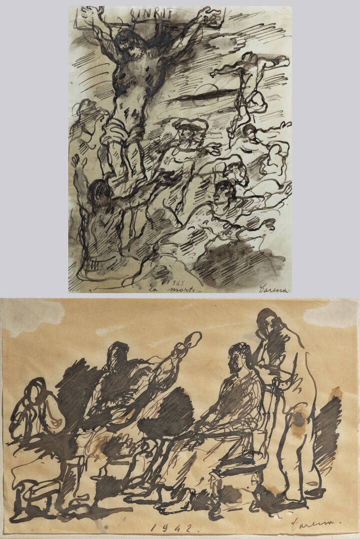 FELICE CARENA Cumiana (TO) 1879 - 1966 Venezia : a - La morte 1948 b - In giardino 1942  - Asta Asta di Dipinti - Associazione Nazionale - Case d'Asta italiane