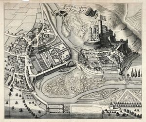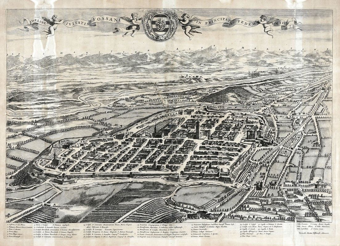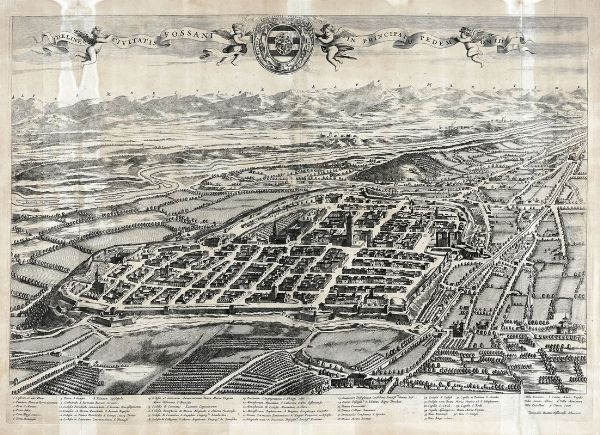 Acquaforte. mm 485x580/700. Foglio: mm 533/550x640/740. Tre tavole da Theatrum Statuum Regiae Celsitudini Sabaudiae Ducis, Pedemontii Principis... La prima edizione di questa monumentale opera uscì ad Amsterdam [Haeredes Ioannis Blaeu] nel 1682, seguirono altre edizioni nel 1693, 1697, 1700, 1725 e 1726. Illustrata da 142 tavole incise in rame, in gran parte su doppio o triplo foglio, raffiguranti ritratti, carte geografiche, piante topografiche e vedute prospettiche di Torino e di città e paesi del Piemonte e della Savoia. I disegni per i rami furono eseguiti da Giovenale Boetto, Simone Formento, Federico Guazzo, Carlo Morello e Giovanni Tommaso Borgonio.