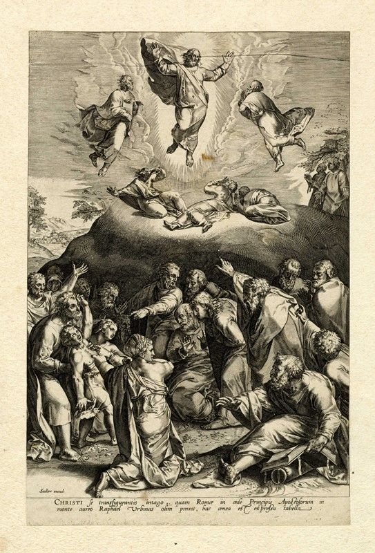 Bulino. mm 295x194. Dall'originale incisio da Cornelis Cort nel 1573 (New Hollstein, 54). Il soggetto è tratto dalla pala di Raffaello sull'altar maggiore della chiesa di San Pietro in Montorio. Bella prova su carta vergellata sottile con filigrana "P gotico".