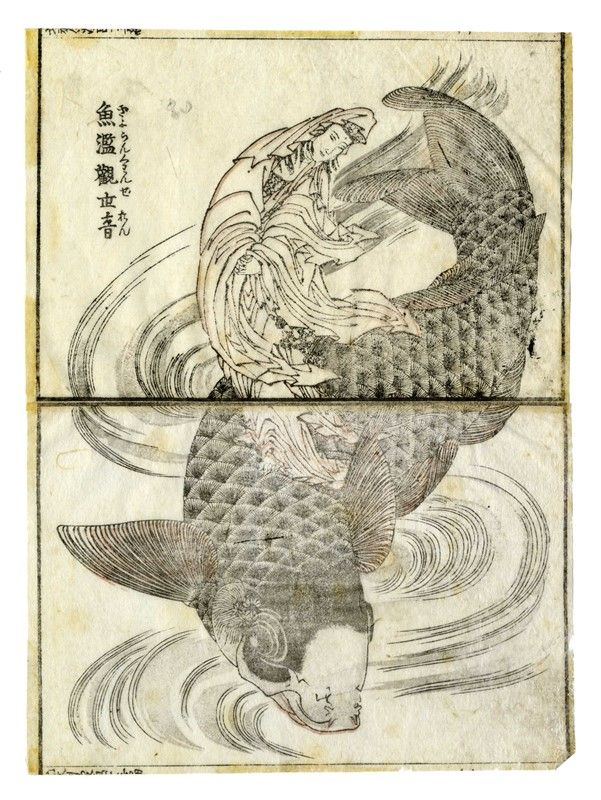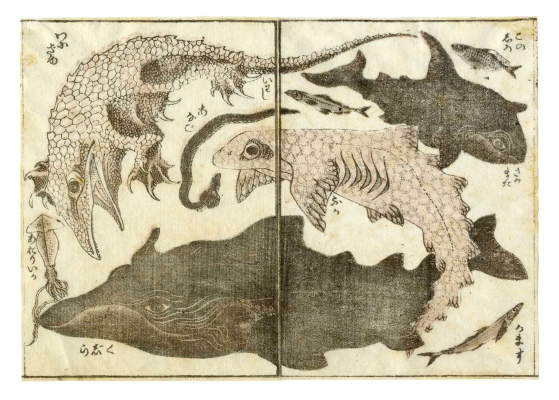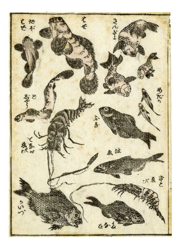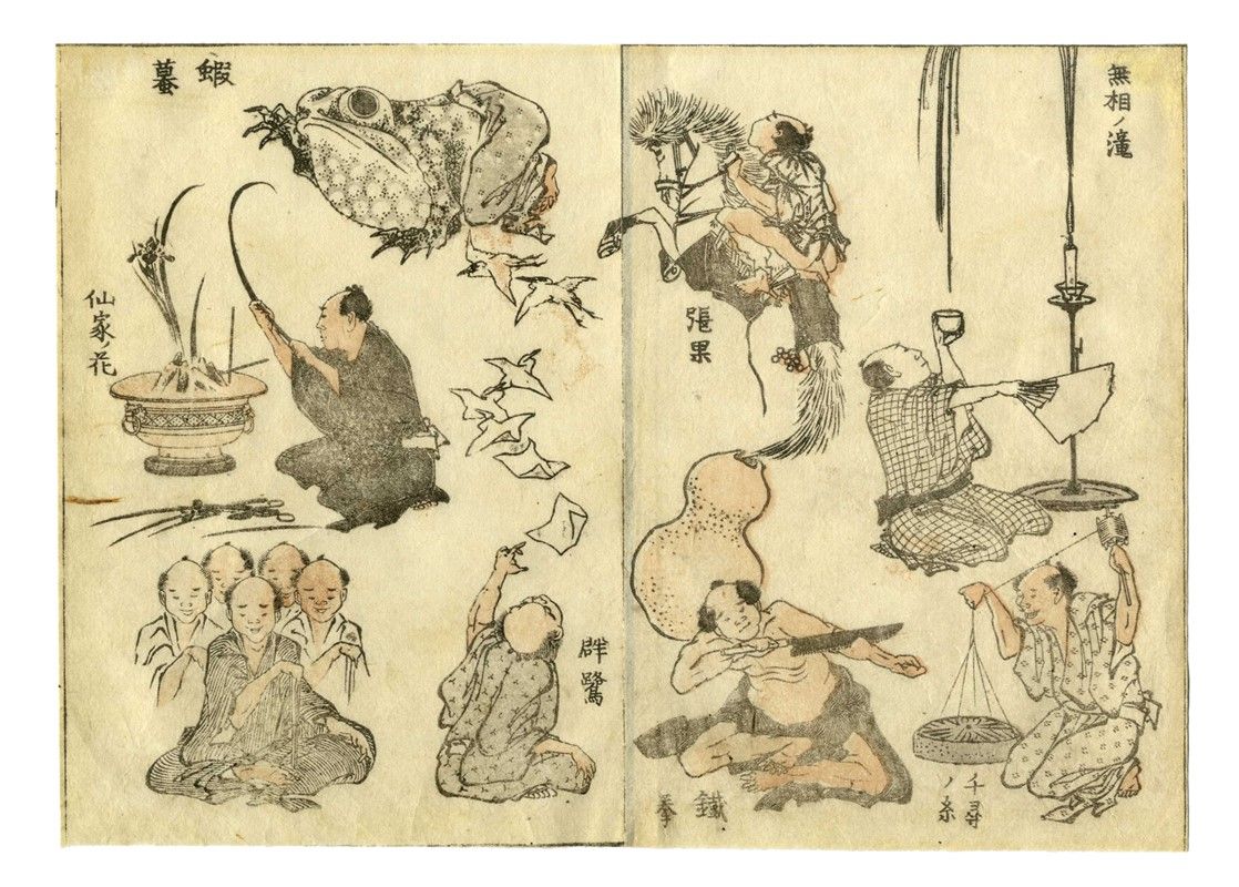 Xilografia in bianco, nero, grigio e rosa. mm 177x128/248. Cinque tavole, tre doppie e due singole, quattro delle quali su carta sottilissima, provenienti da James A. Mitchner, The Hokusai Sketch-Books: Selections from the Manga, Rutland & Tokyo, Charles E. Tuttle Company, 1958 e seguenti. Gli Hokusai Manga sono una raccolta in quindici volumi, il primo pubblicato nel 1814 quando l'artista aveva cinquantacinque anni, e gli ultimi tre pubblicati postumi, che costituiscono un repertorio di illustrazioni - figure umane, fiori e uccelli, paesaggi, demoni e personaggi mitici - per rappresentare svariati soggetti in attitudini diverse, un ottimo manuale di disegno dell’epoca.