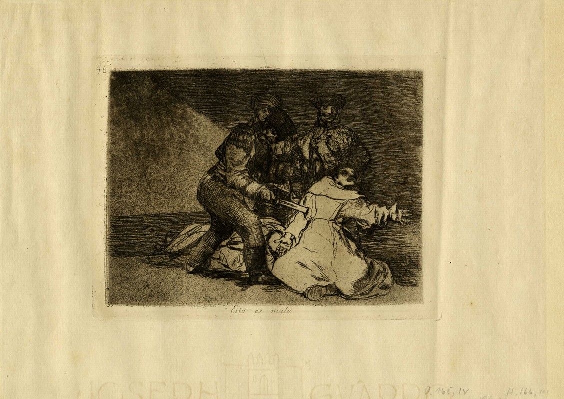 Acquaforte, bulino, puntasecca, brunitoio, lavis. mm 155x203/2044. Foglio: 245/247x335/340. Harris, 151, 166. Due tavole da Los desastres de la guerra, serie in 80 tavole alla quale Goya si dedicò dal 1810 al 1820, ma che venne pubblicata per la prima volta solo nel 1863. La raccolta conta sette edizioni, l'ultima delle quali realizzata nel 1937 durante la guerra civile spagnola. Ottime impressioni dalla V edisione di 7 stampata dalla Calcografia per la Real Academia nel 1923. Carta vergellata con filigrana "Joseph Guarro e torre" visibile a uno dei due fogli.