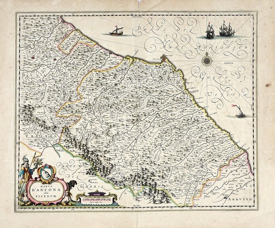 Incisione in rame in coloritura. mm 385x502. Foglio: mm 503x620. Testo francese al verso. Mappa che ripete la cartografia del Magini e inserita per la prima volta nel terzo volume del Theatrum Orbis Terrarum, verosimilmente pubblicato nell'edizione francese del 1640 e dal titolo Le Theatre du Monde ou Nouvel Atlas... A Amsterdam, Chez Iean & Corneille Blaeu MDCXL.