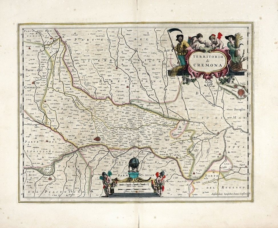 Incisione in rame in coloritura. mm 375x490. Foglio: mm 495x600. Testo francese al verso. Carta geografica raffigurante parte della Lombardia, in particolare i territori di Cremona, Mantova, Crema e Piacenza. In alto a destra titolo entro cartiglio figurato con putti, e coppia di coloni con strumenti da lavoro e fasci di grano e uva. In basso al centro scale miliari entro edicola figurata