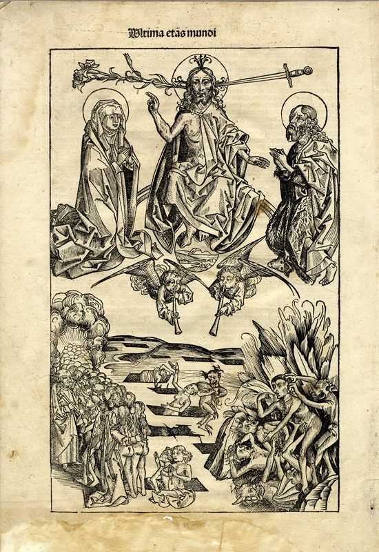Xilografia. 362x228. Foglio: mm 440x302. Da Liber chronicarum. Nuremberg: Anton Koberger per Sebald Schreyer e Sebastian Kammermeister, 12 luglio 1493. Tavola tra le più ricercate della Cronaca mostra Cristo, giudice e salvatore di anime, in trono su un arcobaleno, il globo ai suoi piedi e ai lati della testa il giglio e la spada. Maria e Giovanni Battista pregano al suo fianco per i defunti che risorgono dalle tombe, la maggior parte di loro si unisce al seguito dei beati verso il paradiso dove Pietro li attende al cancello con la chiave, mentre i dannati vengono trascinati all'inferno dai diavoli.Tra i primi libri stampati e sicuramente il più ampiamente illustrato del XV secolo, la Cronaca vide coinvolte negli intagli e nella redazione del progetto molte personalità tra le quali il pittore ed incisore Michael Wohlgemut (Norimberga 1434-1519) e il suo figliastro Wilhelm Pleydenwurff (Norimberga c. 1450-1494); lo stampatore Anton Koberger (Norimberga ca. 1440-1513), gli editori e mecenati Sebald Schreyer (Norimberga 1446-1520) e Sebastian Kammermaister (1446-1503).