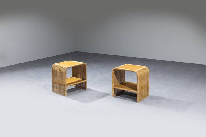 Coppia di comodini in vimini e bamboo. Anni '70 cm 45x45x36
